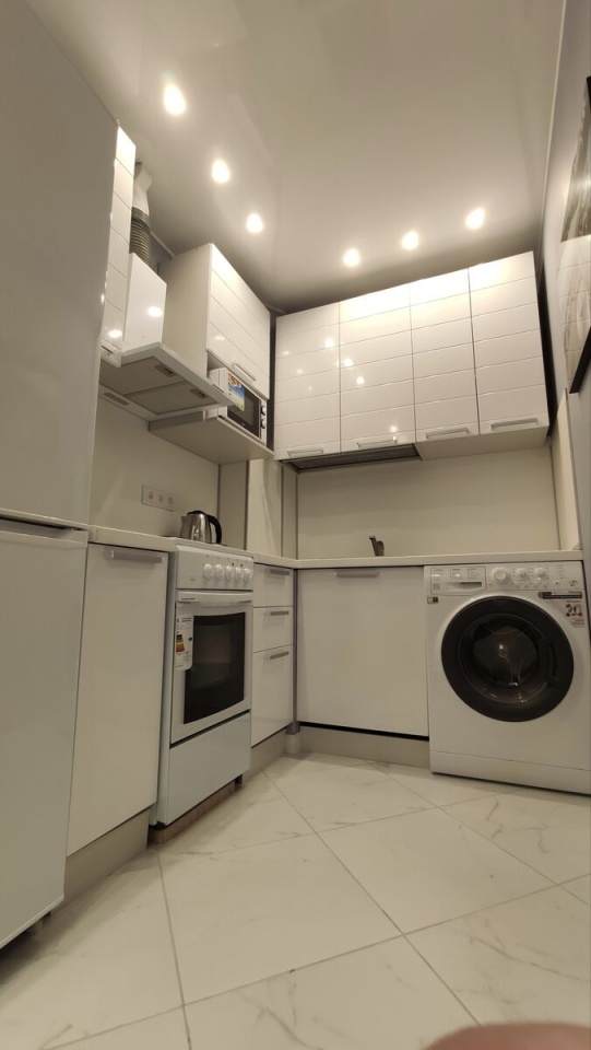 Встроенная кухня. Холодильник. Стиральная машина. Телевизор. Духовка. Варочная панель. Вытяжка.