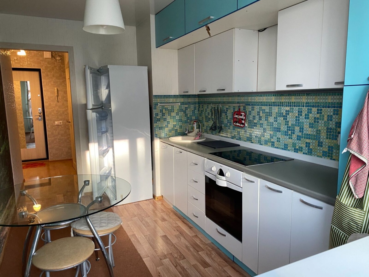 Современная встроенная кухня, оборудованная всей необходимой бытовой техникой, остается новому владельцу.