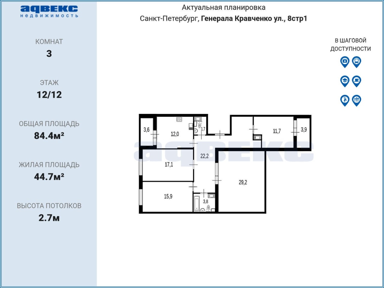 ID: 1916003 Просторная 3-комнатная квартира с уникальной планировкой на 12 этаже монолитного дома. Идеальный вариант для большой семьи. — Планировка квартиры: 3 комнаты, кухня 12 кв. м., прихожая 22 кв. м., два санузла, две лоджии, один балкон. Общая площадь квартиры: 84.4 кв. м. и зимняя теплая лоджия 30 кв. м итого более 110 кв. м. — Этаж: 12/12, монолитный дом, два лифта: пассажирский и грузовой, сквозной проход через парадную: можно выйти во двор, можно на проспект. Двор без машин и закрыт для посторонних. Транспортная доступность: Автобусы и троллейбусы до 4 станций метро: пр. Ветеранов, Ленинский, Автово, Юго-Западная. Остановки у дома. Пешком до станции Сергиево 15 минут, электричка до ст. м. Балтийская и Балтийского вокзала — 30 минут. Инфраструктура: На территории ЖК: детские сады, школы, пекарни, аптеки, салоны красоты, продуктовые магазины, пункты выдачи заказов, детские площадки, парк с прудами и велодорожки. Покупателю остается: — Кухонный гарнитур от фабрики «Аврора» с индукционной варочной панелью, духовым шкафом, вытяжкой и посудомоечной машиной. — Шкаф-купе в прихожей, стеллаж в хозблоке. — Москитные сетки на окнах, счетчики на радиаторах. Собственники — семья. Приобретали квартиру у застройщика. Полная стоимость в договоре. Встречная покупка. По телефону отвечу на ваши вопросы. Показы по договоренности. Звоните.