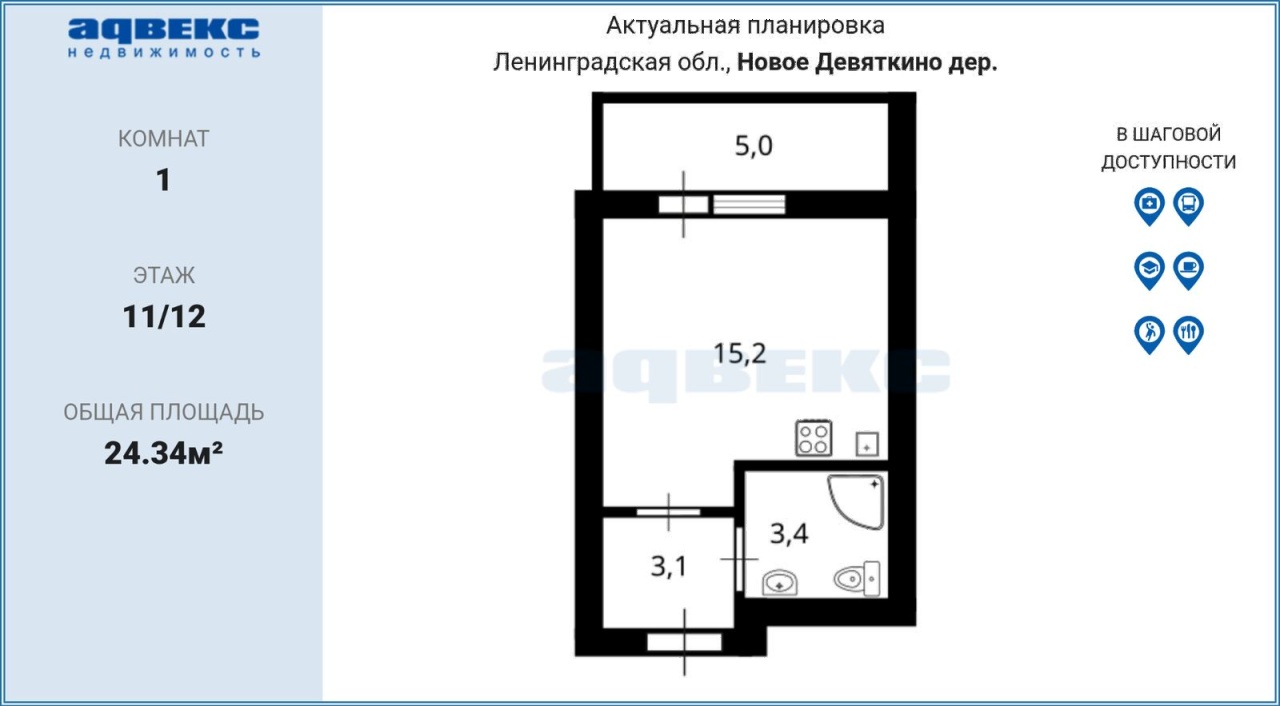Предлагается к продаже квартира-студия общей площадью 24.3 квадратных метра в новостройке, расположенной в деревне Новое Девяткино Всеволожского района Ленинградской области. Жилой комплекс находится в пешей доступности от станции метро «Девяткино».