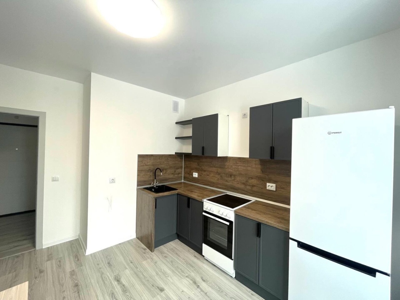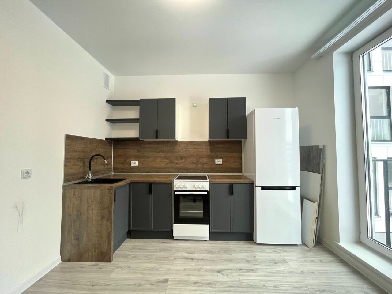 Кухня просторная. Может служить и гостиной. Помещения оборудованы всем необходимым: на кухне установлена мебель, есть мягкий уголок с дополнительным спальным местом, а также холодильник и электрическая плита. В квартире выполнен современный евроремонт от застройщика. Окна выходят во двор, имеется балкон в комнате, а на кухне -французский балкон.