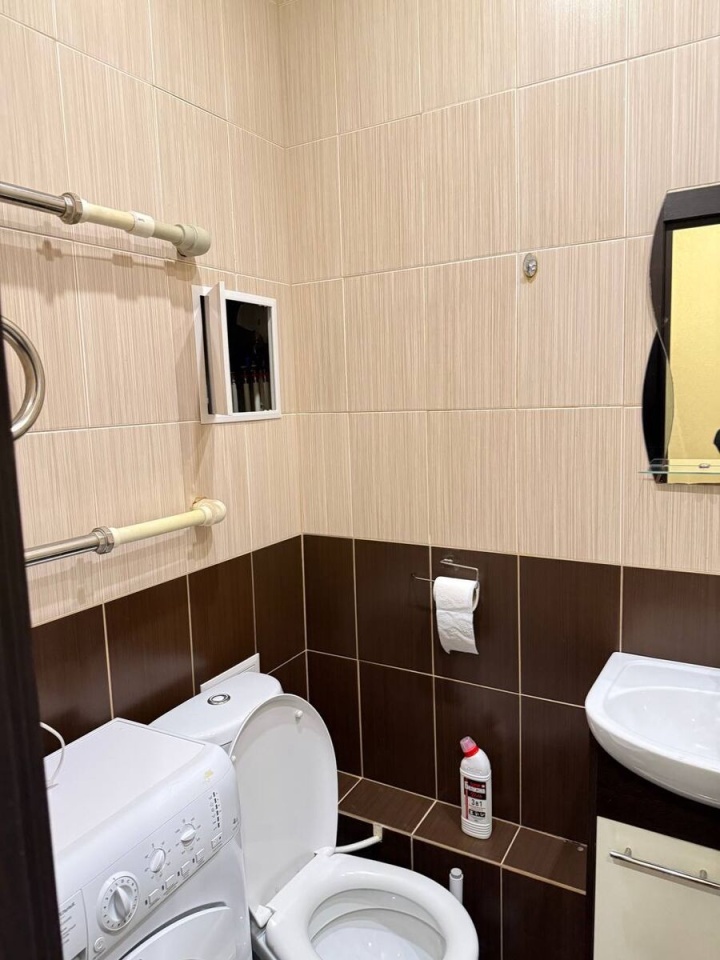 Вся необходимая мебель есть в квартире: диван 2-х спальный, 3-х створчатый платяной шкаф, встроенная прихожая с вместительным шкафом и встроенная кухня - варочная панель, вытяжка, холодильник, обеденный стол, телевизор, стулья, тумба по ТВ, а также стиральная машина в ванной комнате.