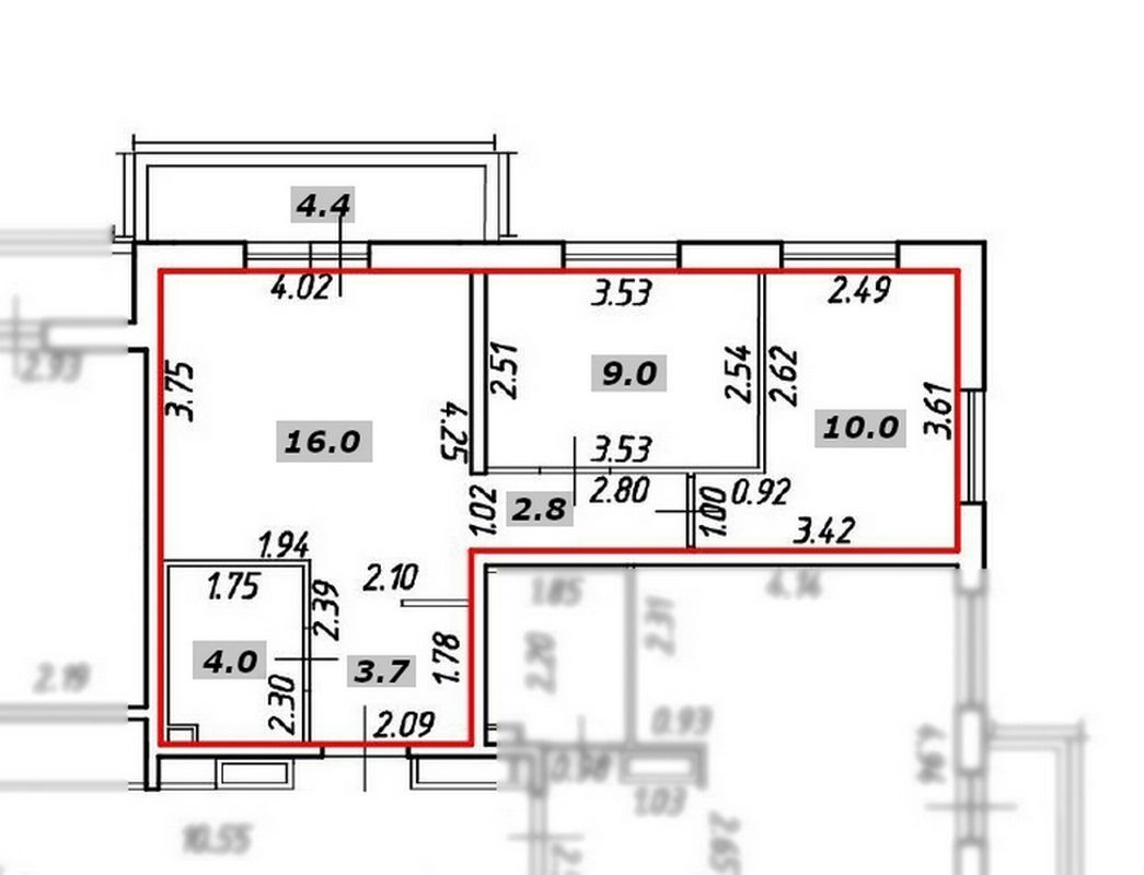 Квартира с двумя отдельными спальнями 10 и 9 кв. м., большой кухне-гостинной 16.2 кв. м. с выходом на застекленный балкон 4.4 кв. м.