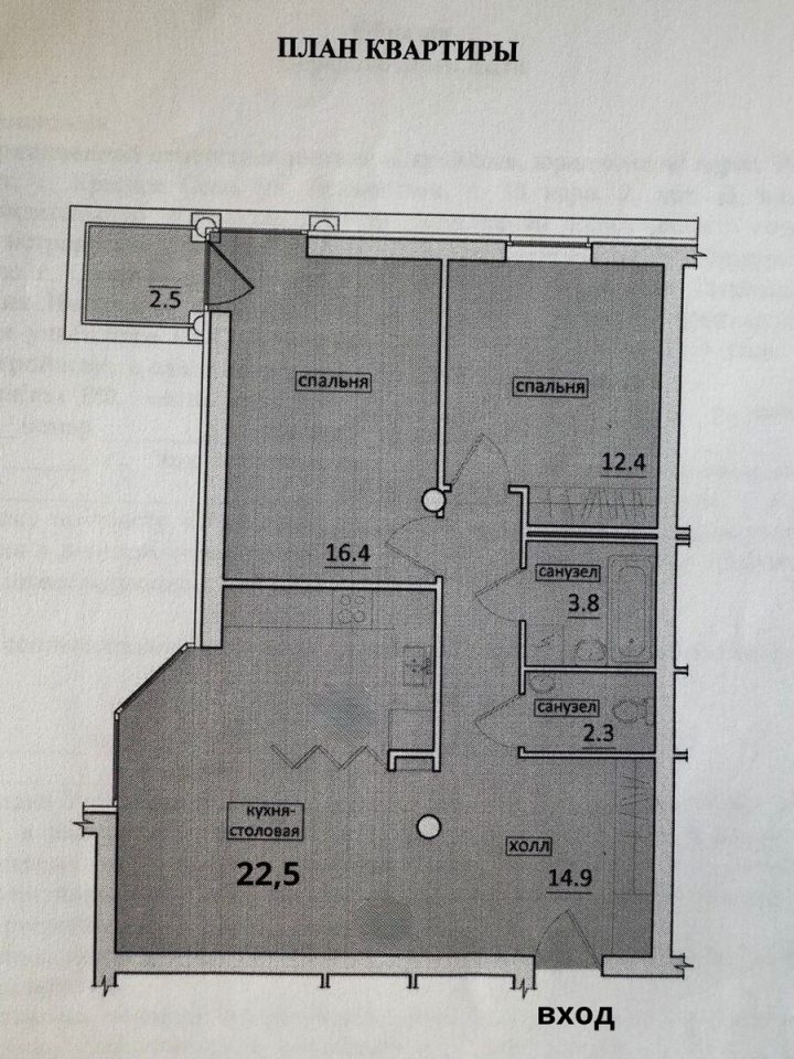 Площадь кухни-гостиной 22.5 кв. м, комнат 16.4 кв. м с выходом на балкон и 12.4 кв. м, санузел раздельный.