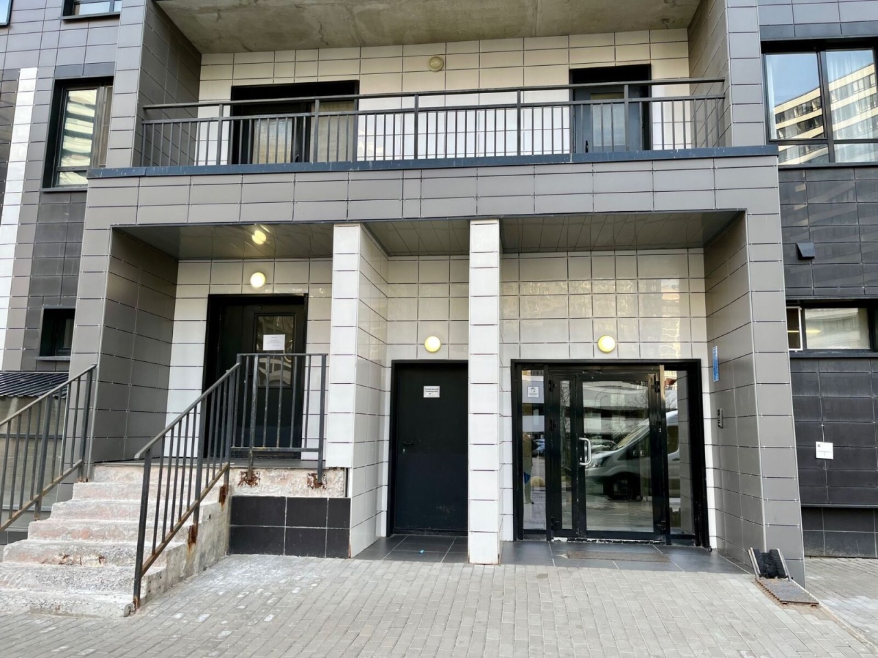 Жилой дом современного типа с закрытой придомовой территорией и просторной входной группой.