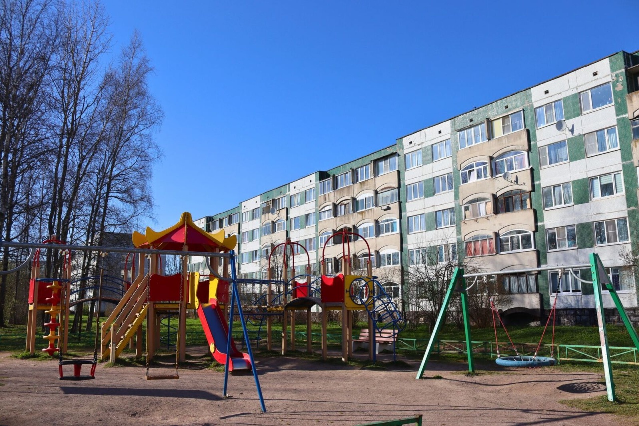 Во дворе детская площадка, рядом спортивная площадка.
