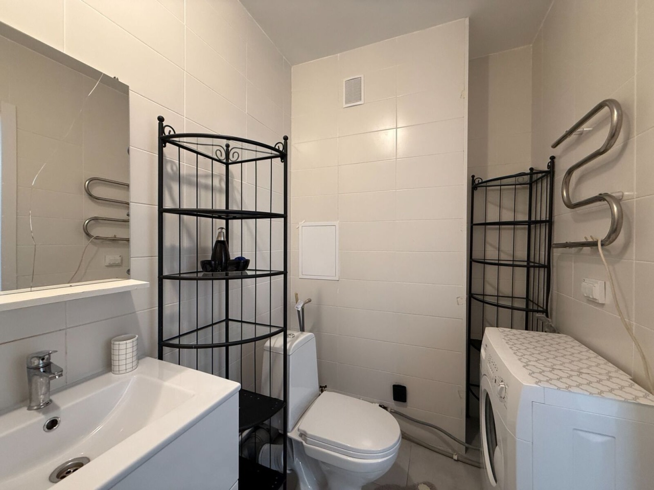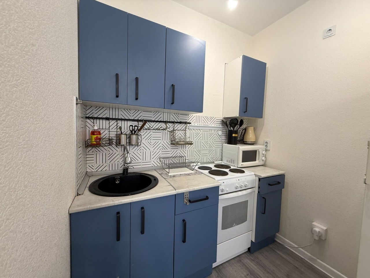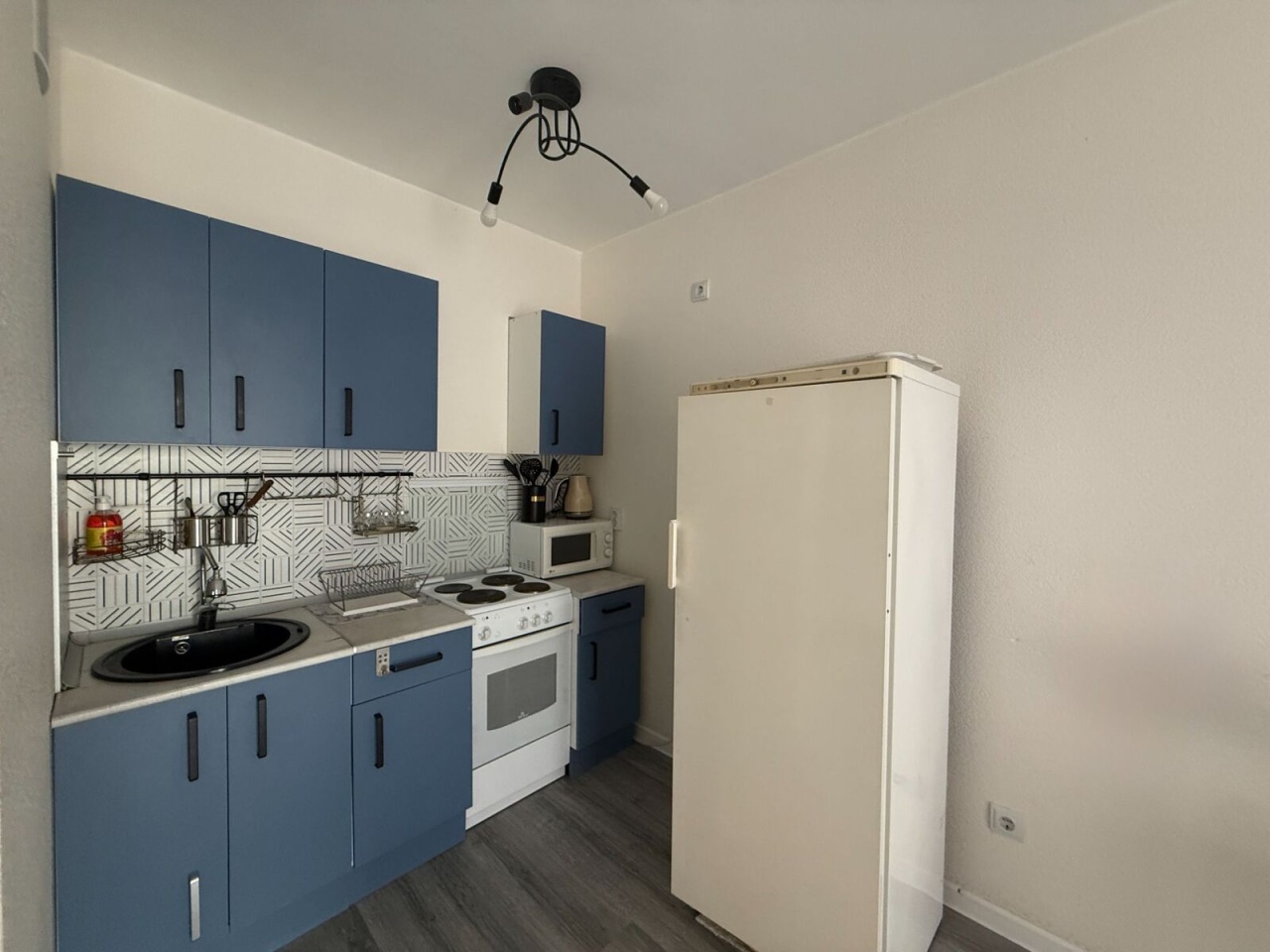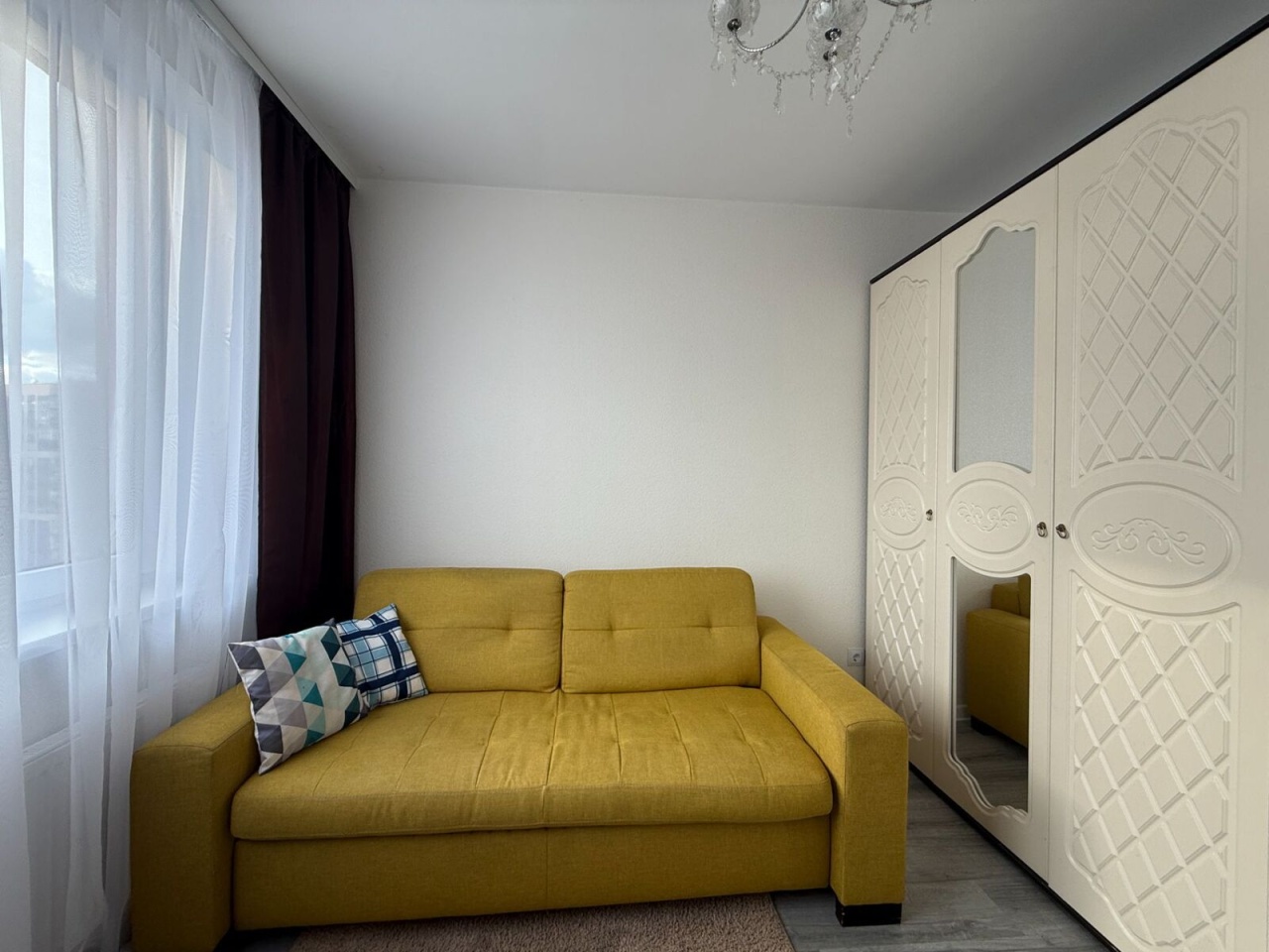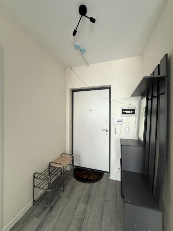 • Мебель и техника: установлен кухонный гарнитур, холодильник, стиральная машина. В спальне диван-кровать, большой шкаф для хранения вещей.