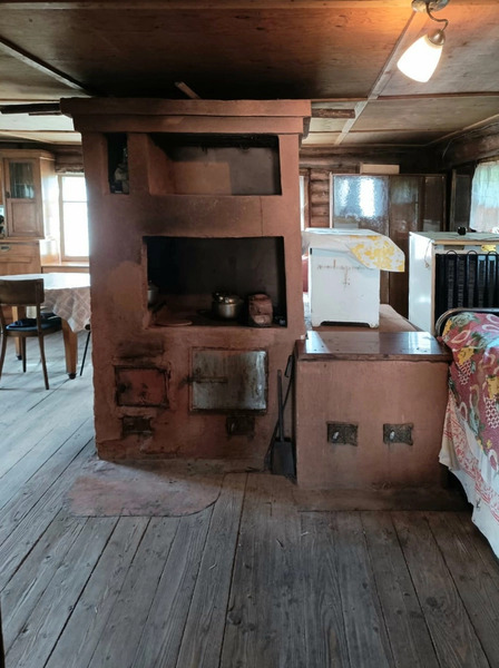 На первом этаже - кухня-гостиная 16.6 кв. м. и комната с печью - 32.1 кв. м.