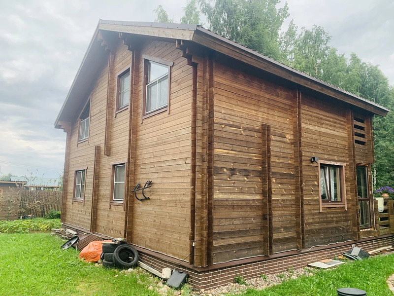 Коттедж построен по финской технологии из двух слоев бруса толщиной 45мм каждый с минеральным утеплителем толщиной 130 мм. между ними.