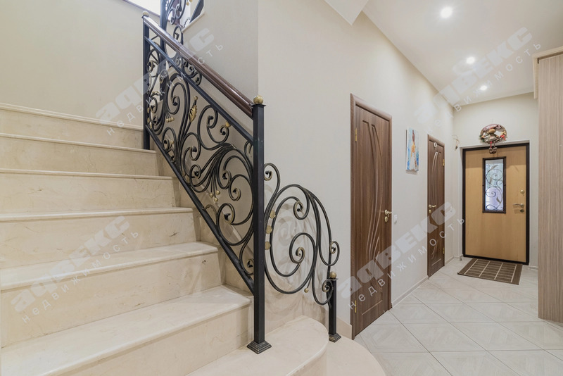 - на  первом этаже большая гостиная и оборудованная кухня, 1 спальня (можно сделать кабинет), санузел. На второй этаж ведет мраморная лестница.