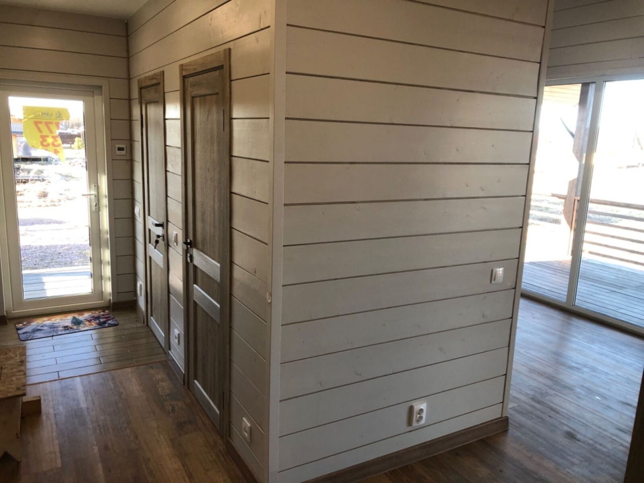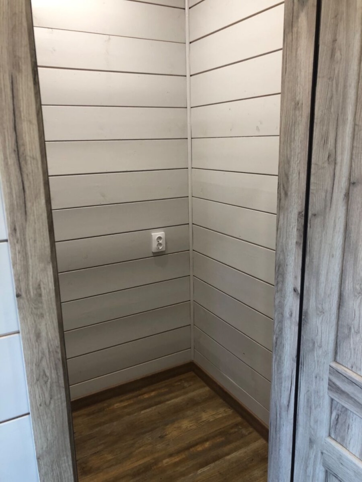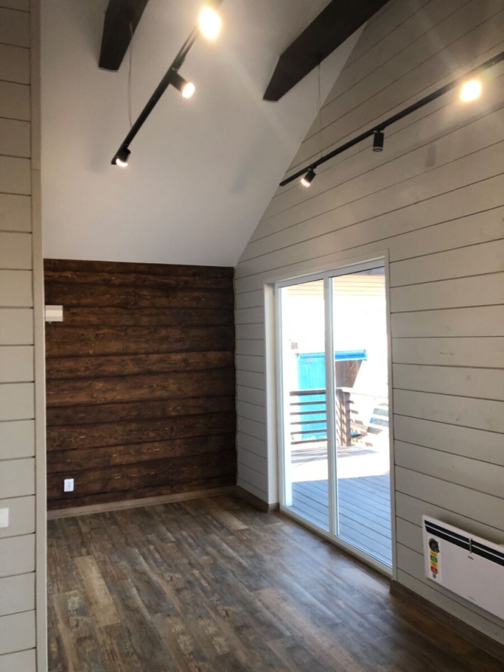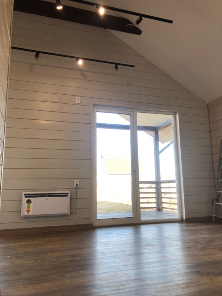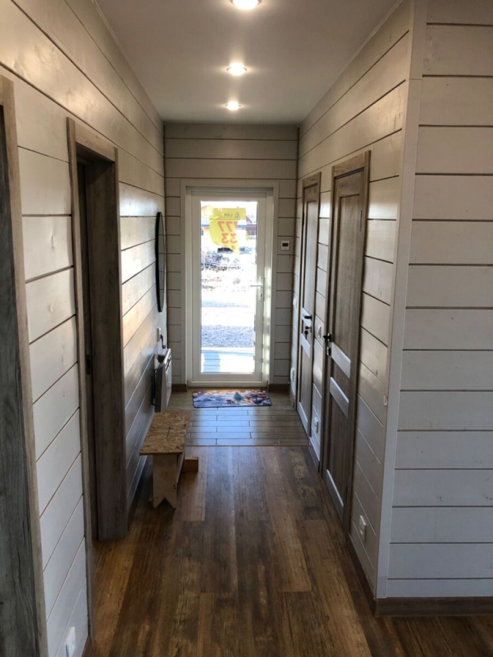 Имитация бруса внутри и снаружи, натяжные потолки, кварцвинил на полу, окна Рехау 70 мм. Санузел с плиткой (теплый пол), полотенцесушителем и сантехникой. Двери экошпон с магнитными замками.