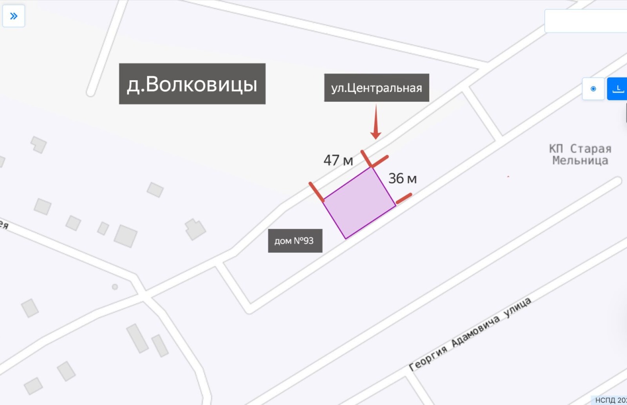 Участок прямоугольный, 47 * 36 м, расположен в центре обжитой деревни Волковицы всего в 20 км от Санкт-Петербурга.